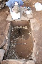 The cist was built around 2100 - 1950BC, some 500 years after the henge was constructed. Placed within a large pit, the sides of the cist were composed of large sandstone slabs supported by packing stones (measuring 1.7m NE-SW by 1.15m). Specially selected waterworn pebbles formed the floor of the cist with large quartz pebbles positioned in the south-west end. A layer or mat of birch bark was then laid on the floor of the cist – in preparation for internment. Although bones have not survived in situ, traces of re-mineralised bone was identified adhering to the sides of the cist attesting to the presence of a body in the cist. Accompanying the body was a rich collection of grave goods, including a bronze dagger and knife, two wooden containers and other organic and stone objects. Click here to read more about the contents of the cist.