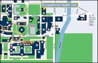 Occupational Health is located at 63 Oakfield Avenue. The map below illustrates the location of the Unit (E10 on campus map).