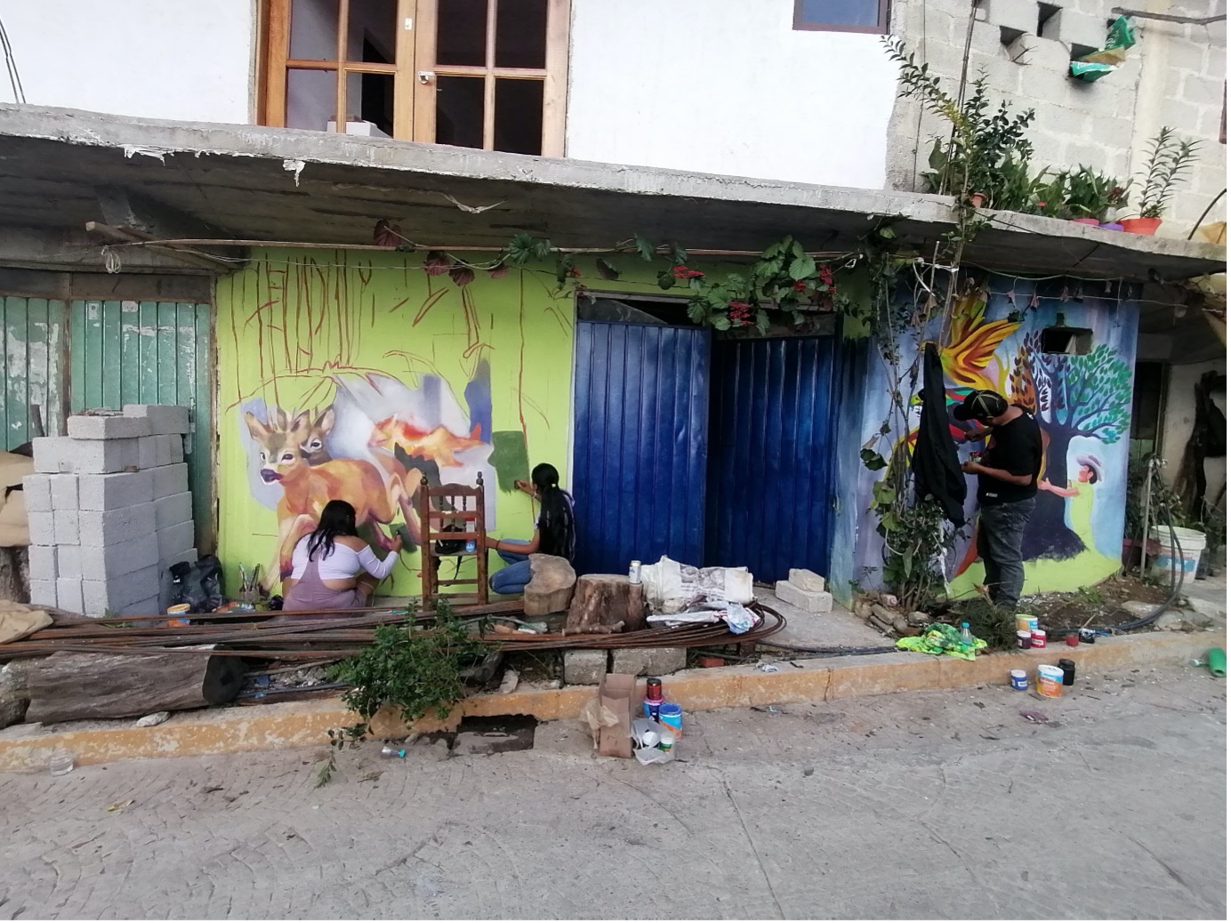Mariela López and Asunción Alvarado painting a mural together in Huautla de Jiménez
