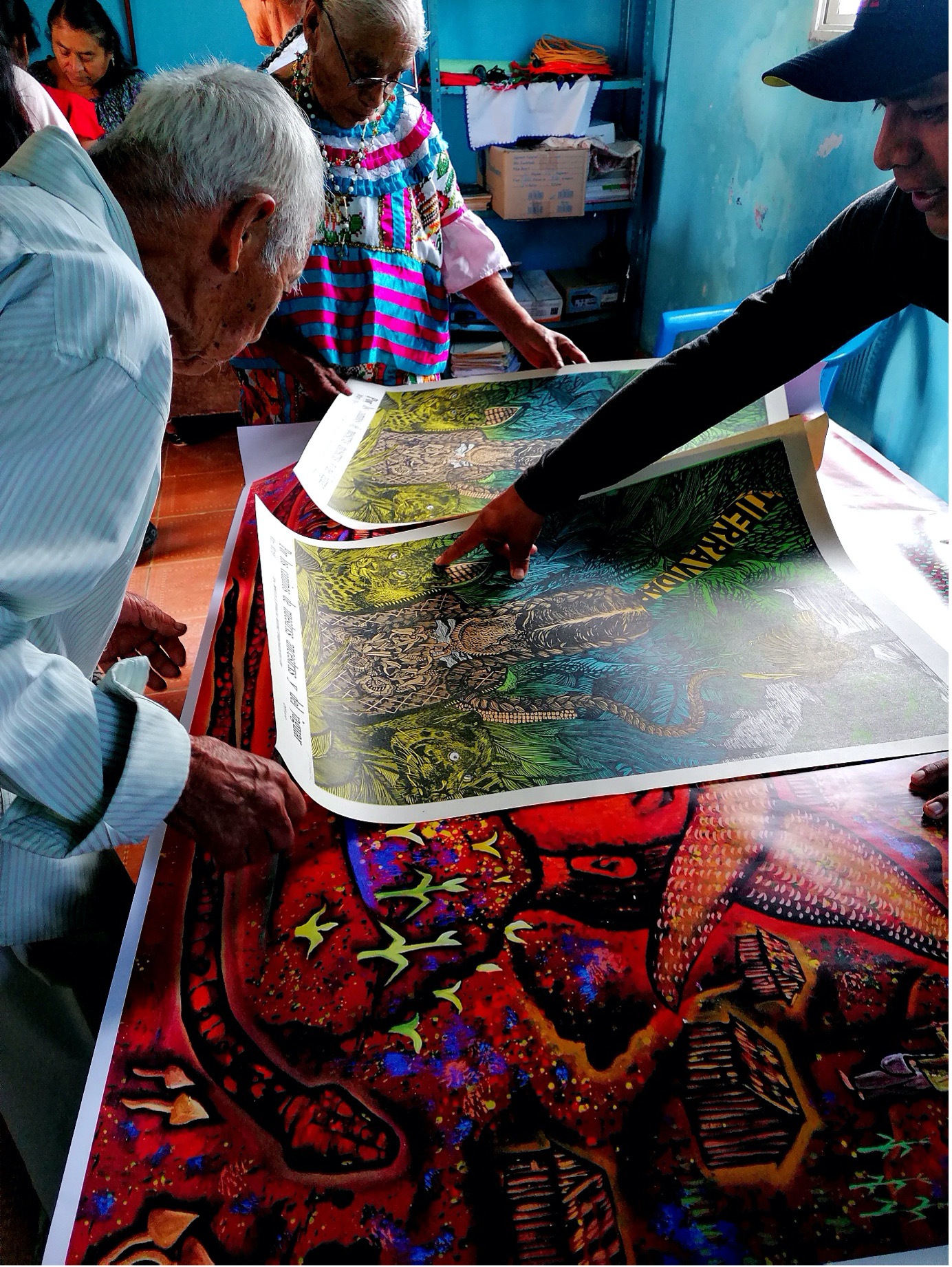 The FSN commissioned two Mexican artists, Mariela López and Asunción Alvarado to accompany these transregional and intergenerational conversations in Mexico. Asunción Alvarado participated in the meetings in the Mazateca and produced his Mazatec Cosmovision, which illustrates the ongoing connections between people, the earth, and the cosmos, that are renewed through dialogues and care for the earth. Mariela López travelled with the FSN to the Chimalapas in 2023 and produced her artwork, which responds to the dialogues about shared experiences of agroecology, resistance, and the importance of the natural world. In 2024 Mariela López travelled with the FSN to the Mazateca and met the artist Asunción Alvarado. Both artists distributed reproductions of their artworks to different communities in the Mazateca who had taken part in earlier conversations about history and agroecology. Both artists worked together to produce a mural, in Huautla de Jiménez, to represent what they had learned about the historic and contemporary challenges to the natural world and the importance of agroecology. This was a poignant time for reflection as wildfires were raging in the Mazateca, as they had previously in the Chimalapas.