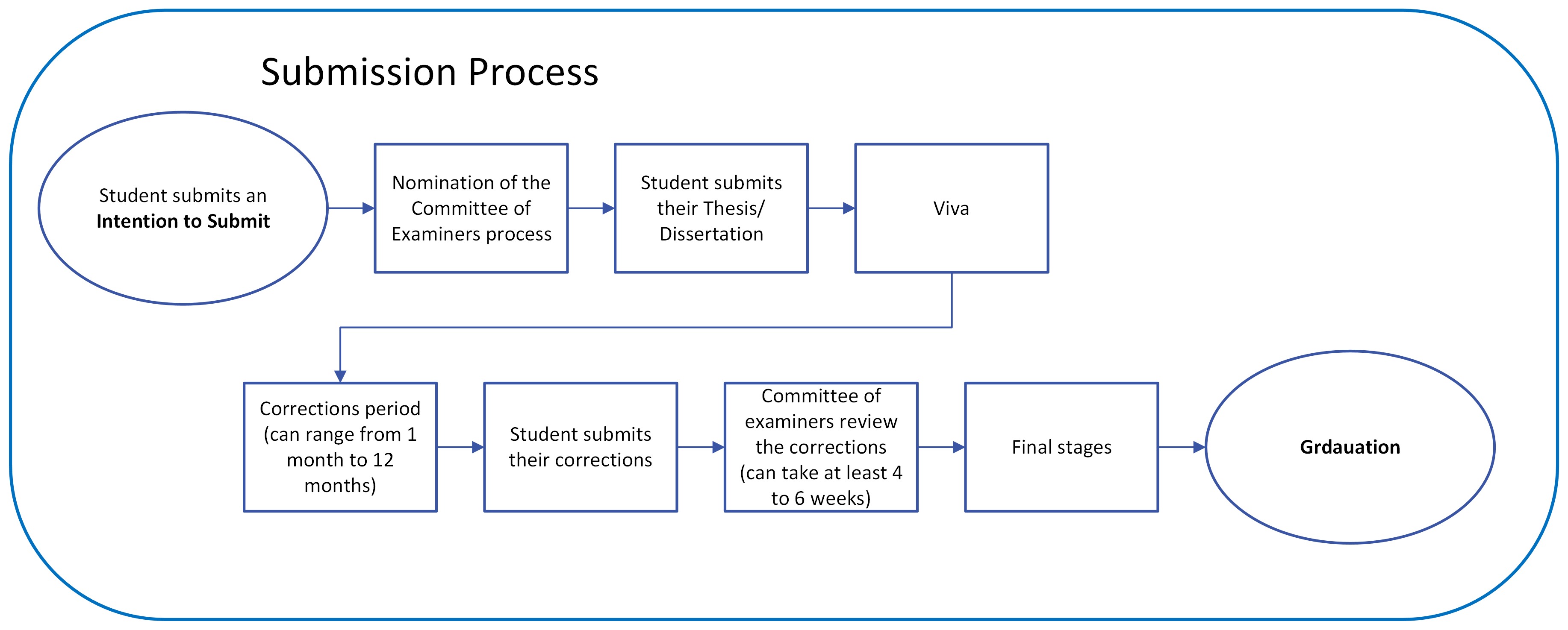 Final confirmation of the format for submission will be required when the student submits their Intention to Submit notification; we strongly encourage that this is done as early as possible (i.e., 6 months prior to intended submission).