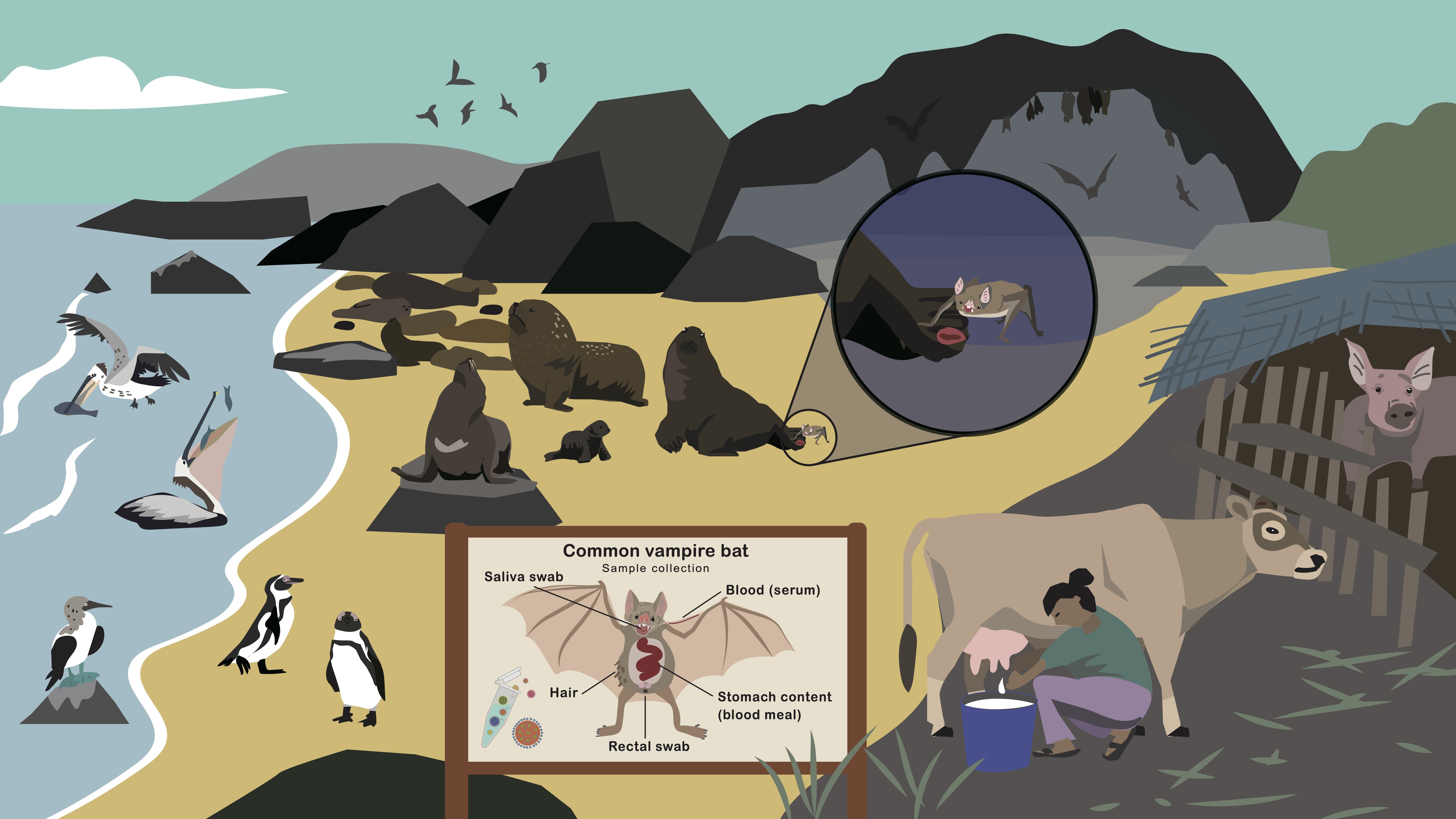 For my PhD, I am investigating viral exchange at the marine-terrestrial interface. Blood-feeding vampire bats can potentially serve as vectors transmitting different viruses to their prey species, including fur seals, sea lions, and domestic pigs.
