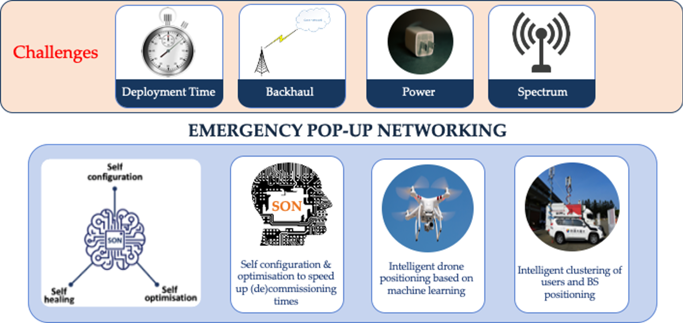 disasters are a huge threat to communication systems either due to network infrastructure being destroyed or the network being overwhelmed by a sharp rise in traffic, thereby degrading network performance. current systems are expensive to operate and maintain in times of emergency, and require significant human intervention, resulting in long commissioning and decommissioning times. this work aims to design a pop-up emergency network, based on the principles of self-organization (configuration, optimization, and healing), that takes into account the peculiarities of emergency communications – power, backhaul, and deployment time. the use of entities such as small cells and unmanned aerial vehicles will also be explored to address the challenges of emergency communications.