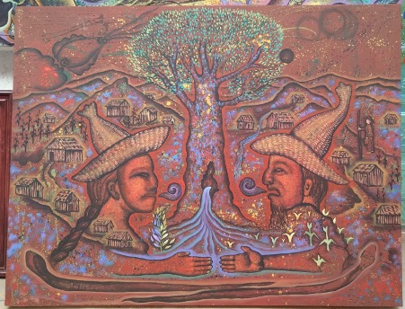 And in that sense, I repeat, it has been a great learning experience, and now in formalizing what we have been doing up to now, it has made me more aware that we have to continue working more, we have to continue insisting more and resist, even more, this system implanted from the outside. Because as Indigenous cultures, sometimes we don’t fit in those standards that are imposed on us and we have to follow the system. So, I try to resist a little bit through language, through Mazatec, and by, for example, making a pictorial composition where I am talking about corn, where I am talking about the language, where I am talking about the use of mushrooms, the use of plants, or the connection that exists with the mountain and the respect for the land.