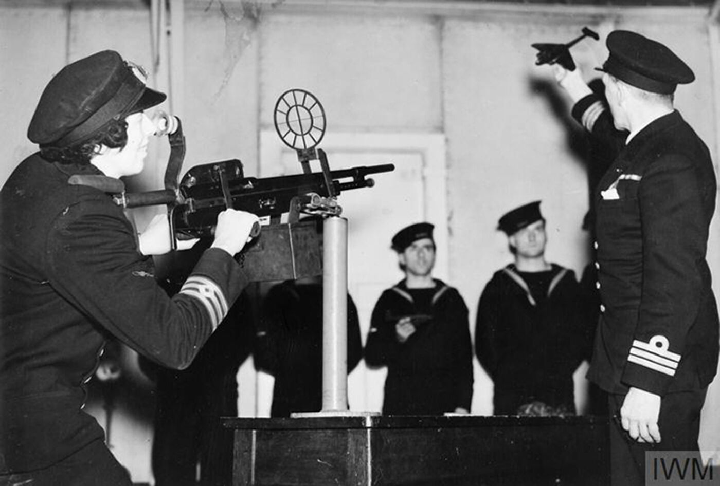 Image: 2nd Engineer Miss Victoria Drummond, MBE, practising shooting with the aid of a model enemy aircraft. © IWM (A 7840A)