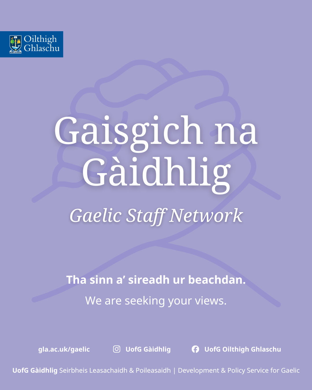 A bheil Gàidhlig agad? Tha sinn a' sireadh ur beachdan air lìonra ùr do luchd-obrach aig Oilthigh Ghlaschu le Gàidhlig. San lìonra seo, bidh sinn a' tighinn còmhla 'son tachartasan neo-fhoirmeil, a' sgaoileadh fiosrachadh mu iomairtean is gnìomhan Gàidhlig ann an Glaschu, agus a' brosnachadh a' chànain air feadh an Oilthighe.