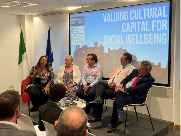 Speakers included Veronica Ferrucci, Consul General of Italy in Edinburgh; Professor Sir Anton Muscatelli, Principal and Vice-Chancellor of the University of Glasgow; Ms Lisa Baird, Deputy Director for Culture & Historic Environment at the Scottish Government; Dr Adam Jackson, Head of Strategy and Policy at Historic Environment Scotland; Ms Aruna Francesca Maria Gujral, Director-General of ICCROM (joining remotely from Rome); Mr Harman Sagger, Head Economist for Arts, Heritage and Tourism at the UK Department for Culture, Media and Sport (DCMS); and Professor Patrizia Riganti (University of Glasgow), Principal Investigator of the AHRC–DCMS funded CAVEAT project.