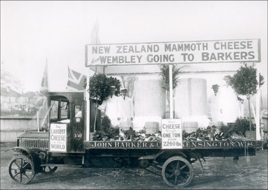 Mammoth New Zealand Cheese. Purchased by John Barkers from the Wembley exhibition: Cheeses loaded ready for transportation to the store in Kensington, 1924.(GUAS Ref: HF 51/8/1/1/3 photo 13. Copyright reserved.)