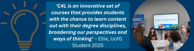 If you would like to develop a Curriculum for Life course for the academic year 2026/2027, we would love to hear from you. C4L courses are credit-bearing, elective modules designed to help students engage meaningfully with learning, knowledge, and ways of practicing beyond their core disciplines. They are aligned with the UN Sustainable Development Goals (SDGs), with a focus on real-world challenges, fostering future-ready skills, and encouraging collaboration across subjects, schools, and degree programmes.