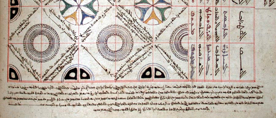 | This Arabic manuscript, written on stout oriental paper, probably dates from fifteenth century Mesopotamia. It is written mostly in Syriac script - Serta for the main text, and Estrangela for inscriptions on the illumination. Arabic script is also employed for the headings to the tables. Such manuscripts are called Karshūnī and the practice is exclusive to Arabic written by Syrian Christians. |