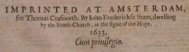 | Joris Veseler (1589-1624) and his successor John Frederick Stam (1602-1667) were established printers in Amsterdam. Veseler was amongst the first printers in the city to target the English book market. Stam 'of Gouda' married Veseler's widow in 1628 and took over the business 'by the South-Church.' After a few years he had become one of the leading printers of English texts in the Netherlands, mainly producing Bibles. As we have seen, these were generally printed with false title pages which credited the printing to Barker. |