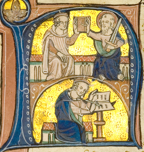 | The manuscript has been well used and its margins are annotated by a number of hands. Although some of the pages have been soiled and marked over time, the high quality of its illustrations suggests that it must have been commissioned by a person of some wealth. Unusually, in this case, we do know who originally owned it. Although the manuscript is not inscribed by any early owner, there are visual clues in many of the illustrations where a figure is found repeatedly: dressed either in a red or blue gown, tonsured, and often kneeling as a supplicant, this figure is identified as "Rogerus" by the text banderoles that accompany several of the pictures. |