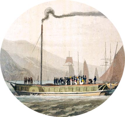 It was not until Lord Shaftebury's 1842 Mines and Collieries Act that the practices Ayton lambastes were finally outlawed. Considering the potential readership of the volume, perhaps this was not the most effective forum on which he might have aired his opinions. Volumes three to six, dealing with Scotland are regarded as the most important sections of A voyage.. It may be true to say that Daniell's prose is turgid and superficial in comparison to Ayton's, but the wealth of stunning engravings included from volume three onwards provides the work with the impressive legacy it enjoys today. Daniell proceeded northwards along the west coast of Scotland depicting beautiful landscapes and technological advancements en route. He sketched not only scenic castles and craggy mountains but also numerous lighthouses, piers and even the first ever illustration of a steam boat: "The stream of smoke from the tall cast-iron chimney generally takes a horizontal direction in consequence of the movement of the vessel, forming a pendant of extraordinary length and singular appearance". |