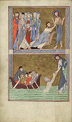 The Psalter is a book of private devotion; popular in the early Middle Ages, it was supplanted by the Book of Hours in the Thirteenth Century. This manuscript opens with a calendar illustrated by the traditional labours of each month and signs of the zodiac. The month for February (folio 1v) is shown below. In common with a small group of extant Twelfth Century psalters, the main text is preceded by a sequence of thirteen richly illuminated full-page scenes from both the Old and New Testaments (folio 13v depicting doubting Thomas and Jesus saving Peter on the sea of Tiberias shown below), followed by further historiated and decorated initials to the end. The style is a mixture of Byzantine modelling and English linear pattern. A splendid example of Romanesque art, the pages retain their original brilliance and vivid colours. The identity of the undoubtedly wealthy patron who commissioned the manuscript's production is unknown, although it may possibly have been Roger de Mowbray (d.1188), from one of the greatest Anglo-Norman families of the twelfth century. Having been a crusader, he had a knowledge of the sacred sites of the Holy Land and also founded the Augustinian houses of Byland and Newburgh near to his castle in Thirsk: these two houses were sacked by Henry VIII's commissioners in 1539/40 and it is argued that at this point the psalter must have been removed and somehow taken to France. Given the number of northern saints commemorated in the calendar (Cuthbert and his translation, Wilfrid, John of Beverley and Oswald), it is likely that its first owner did reside in a Northern Diocese, while three commemorations of St Augustine points to a connection with the Augustinian Canons. It is possible that the various scenes of life on a seigneurial estate may depict that of Roger's. The manuscript consists of some 200 carefully selected vellum leaves, gathered in 29 quires. It is written in an English proto-Gothic book hand: the slightly oval shape of the 'o's and the lozenge shaped thickening of the tops of the minims demonstrate the shift in script from English Caroline. Its script and initials show close similarities to another English psalter now preserved in the Royal Library, Copenhagen (MS Thott 143), and it is probable that the two manuscripts were produced in the same scriptorium. Neither this nor the Copenhagen Psalter has an entry in the Calendar for Thomas Becket, which suggests that they were completed some time before his canonization in 1173. The dioceses of Canterbury, York and Lincoln have all been proposed as possible places of production, but nothing is known for certain. While York is a reasonable place of origin for the scriptorium, the evidence is not firm enough to justify for the manuscript the title of 'York Psalter' as it has previously been known. Several intriguing annotations and amendments hint at past owners of the manuscript. There are post twelfth century additions for a female supplicant (folios 208r-210v) following the Collects; the word endings are later changed to plural male. There is considerable marginalia in French throughout. Most enigmatic of all is a thirteenth century inscription found in the margin of the last folio; this appears to provide in Latin the instructions for the preparation and adminstration of an amulet - to be sanctified at the altar with the Mass of the Holy Ghost and then suspended from the neck of a person afflicted with epilepsy or, perhaps, in danger of death. The language of the charm seems to be in a corrupted form of Old English. Folio 21v depicts King David, the traditional author of the psalter. He is surrounded by his musicians, with the musical notes ut, re, mi, fa etc above the row of bells at the top. See also the