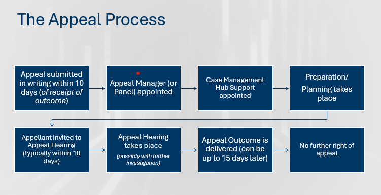 The appeal manager also plays a key role in ensuring closure by confirming next steps and liaising with key stakeholders—including the Employee Relations (ER) Partner, local People & OD, and the Commissioning Manager—to ensure the process is completed consistently and with appropriate support.