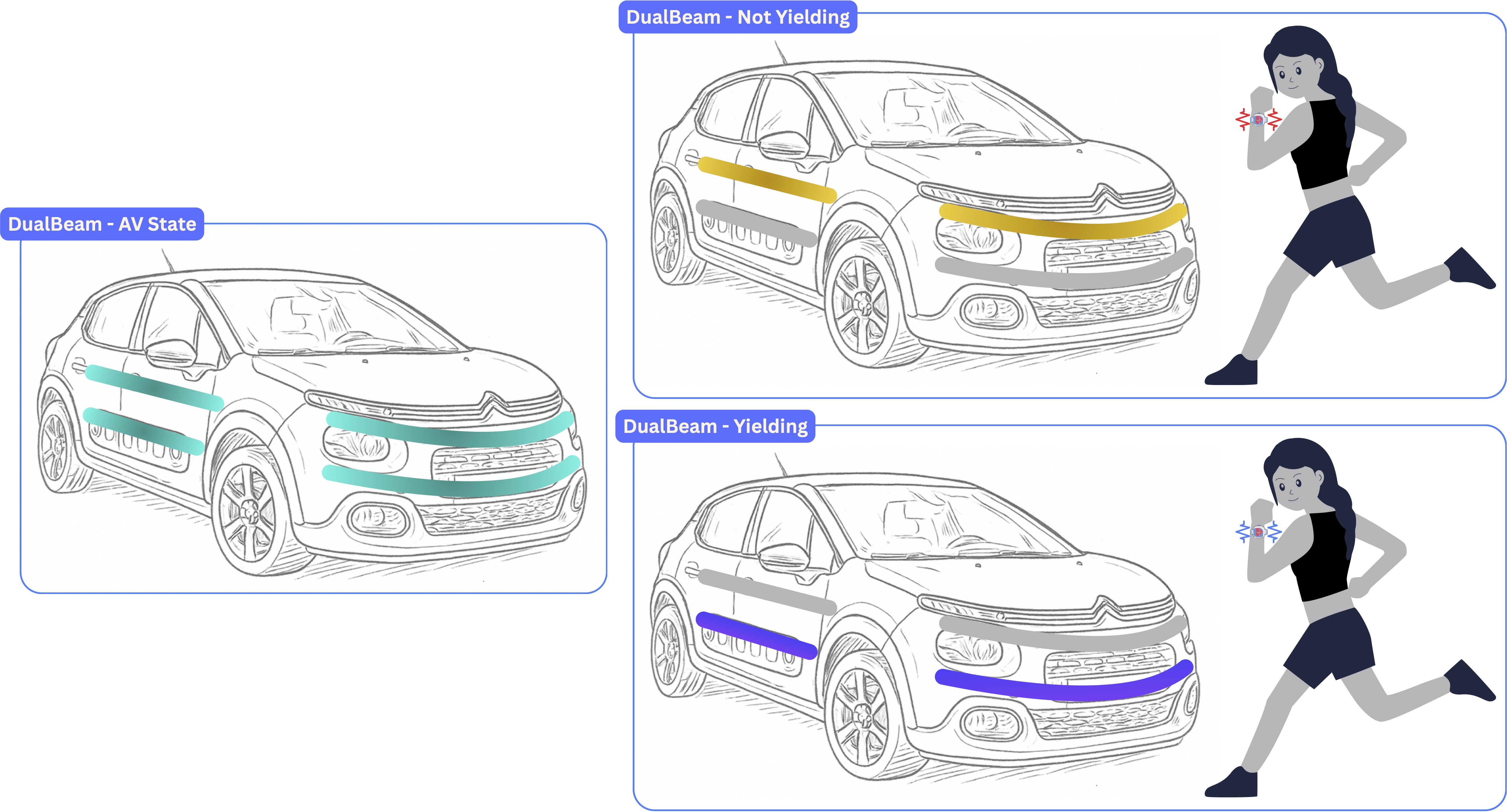 In the paper, the team propose adapting their findings into a new eHMI called DualBeam, which places two rows of lights around each side of the car with colours chosen to be quickly understandable but avoiding the over-familiarity of red and green. Instead, an amber ring would signify the car does not intend to yield, while a purple one would show that the car intends to let the runner pass safely.
