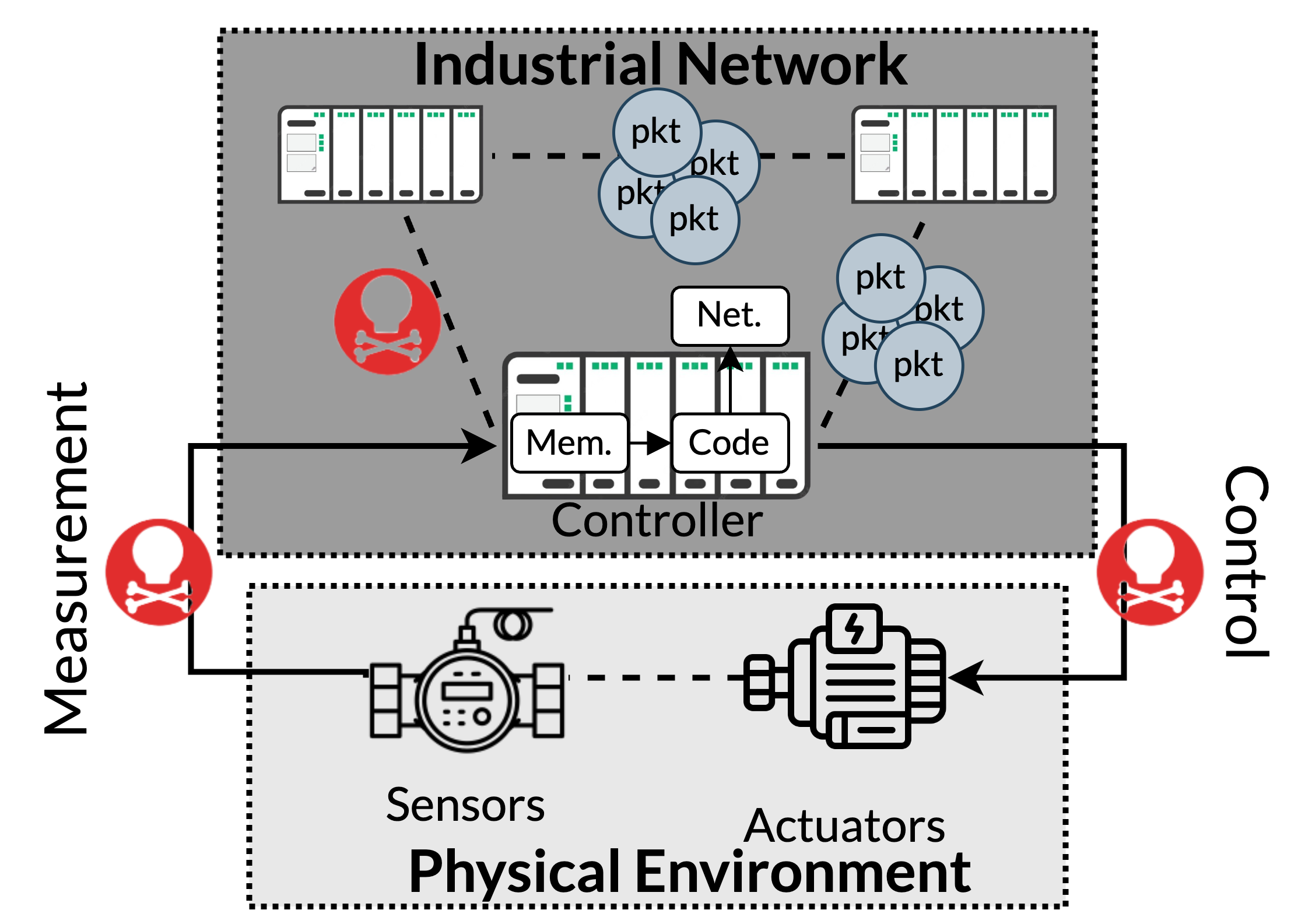 Figure: The natural heterogeneous nature of industrial environments comprising dependencies between network and physical domains. Attack points illustrated demonstrate that anomalies resulting from adversarial behaviour can manifest in different domains.