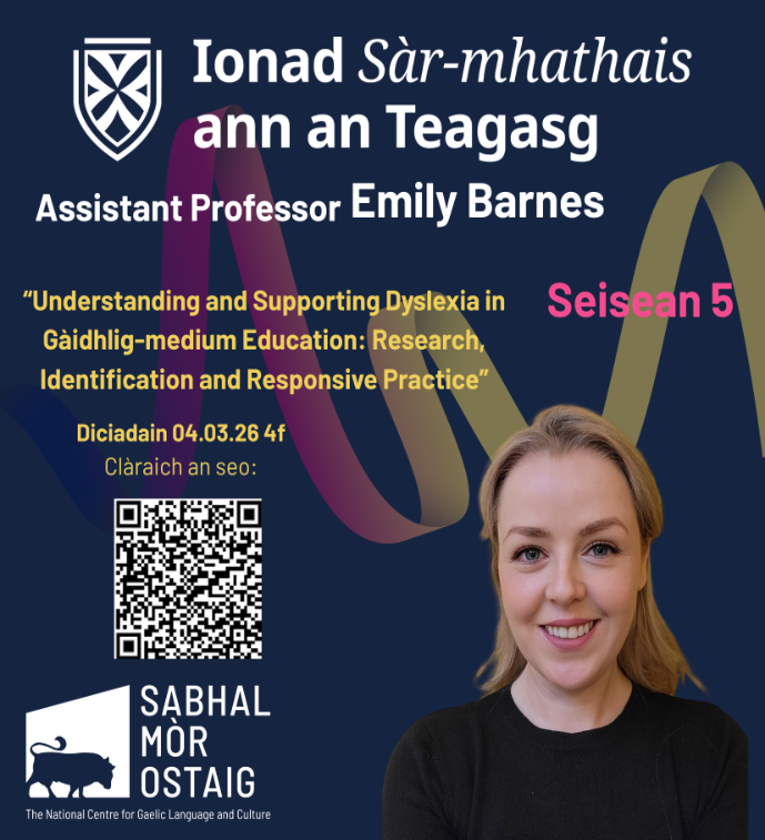 Dyslexia is a complex learning difference that extends beyond reading and spelling and is shaped by cognitive, linguistic, and environmental factors. This seminar explores dyslexia in immersion and dual-language education contexts, with particular attention to how bilingualism and writing systems influence literacy development. It also considers practical approaches to identifying dyslexia and linking assessment to responsive support. Evidence-informed strategies and assistive technologies are discussed, alongside potential areas for practitioner-led research in GĂ idhlig-medium Education.
