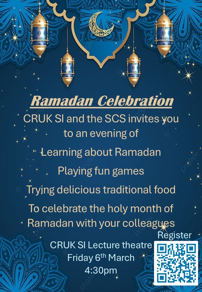 The Ramadan awareness event held on Monday 18th March, illuminated the CRUK_Scotand Institute (SI) lecture theatre and canteen, bringing together colleagues from SCS and CRUK-SI to celebrate cultural richness and community spirit. This collaborative effort between the two organisations aimed to deepen understanding and appreciation of Ramadan while fostering inclusivity, supported by the VOICE committee and CRUK_SI.