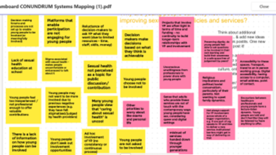 In our fourth meeting, in small breakout rooms we reviewed different examples of existing online sexual health content from key national websites to understand what young people do and do not find engaging. We also continued working on our causal map by using Jamboard to vote on the most important systems factors preventing young people’s involvement in sexual health policy and practice.