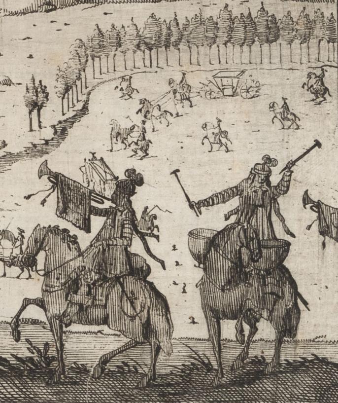 Fig 7 Heralds Announce the Arrival of the Procession. Detail of etching by PhilippeBiffi. In Dissegno della mascherata fatta in Lodi il carnevale dell'anno corrente 1680. Per dimostratione di giubilo delle Regali nozze del Gran Monarca delle Spagne Carlo Secondo all'arriuo dell'Eccellentiss. Sig. Co. di Melgar gouernatore in Milano, e dell'Eccellentissima Signora Cont.sa Consorte il di 26. Febraro. University of Glasgow Library, Special Collections, Sp Coll S.M. 1304.